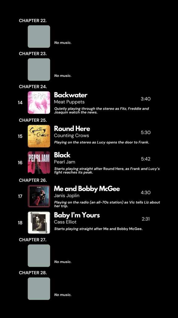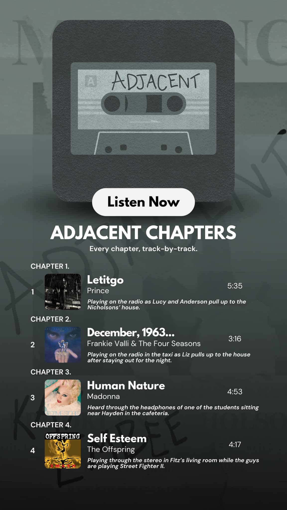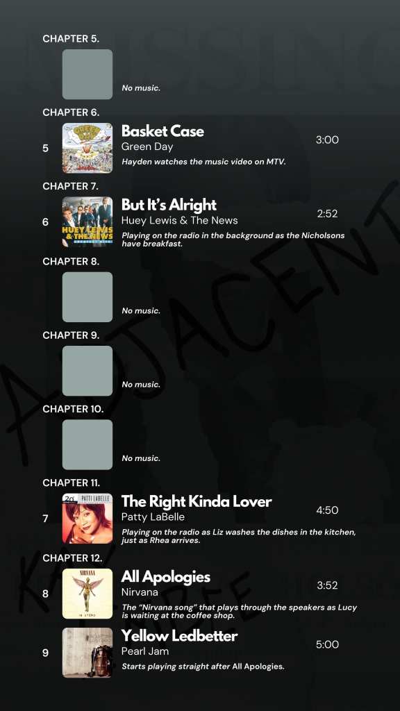 Our second playlist, ADJACENT CHAPTERS, contains every song that Kay Embee had in mind while writing each chapter of the book.